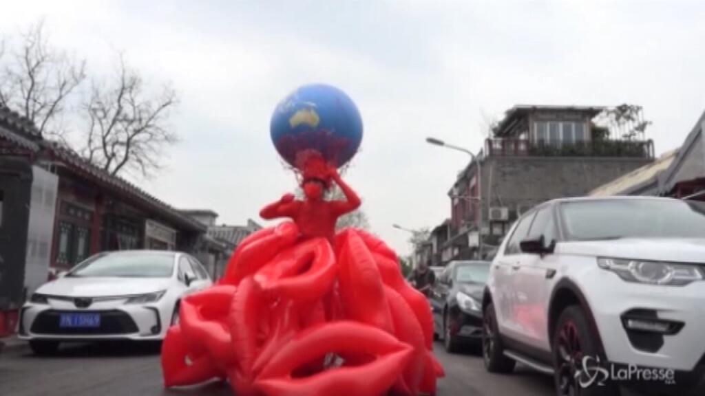 (LaPresse) Un vestito composto da palloncini a forma di bacio e un mappamondo come corona. Così l’artista cinese Kong Ning, per le vie di Pechino, ha cercato di attirare l’attenzione sulle cause ambientali durante la Giornata della Terra. La 64enne Kong ha mostrato le sue iconiche opere d’arte indossabili in ogni Giornata della Terra da oltre un decennio per aumentare la consapevolezza del pubblico sulla pace nel mondo e sulla protezione dell’ambiente. Quest’anno il suo lavoro si intitola: “Kissing the Earth”. L’artista ha usato il “baci” per esprimere “l’amore di tutti gli esseri umani alla Terra”, mentre i fili rossi simboleggiano i vasi sanguigni che la collegano alla Terra.