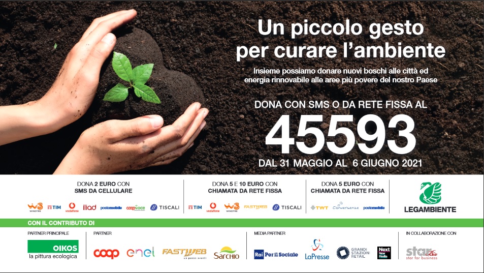 Fino al 6 giugno sarà possibile sostenere la campagna raccolta fondi di Legambiente chiamando o mandando un sms al numero solidale 45593. Il valore della donazione sarà di 2 euro per ciascun SMS inviato da cellulari WINDTRE, TIM, Vodafone, Iliad, PosteMobile, Coop Voce, Tiscali. Sarà di 5 o 10 euro per le chiamate da rete fissa TIM, Vodafone, WINDTRE, Fastweb e Tiscali e di 5 euro per le chiamate da rete fissa TWT, Convergenze, PosteMobile. Con i fondi raccolti si andranno a realizzare 4 progetti di forestazione, nelle città metropolitane di Torino, Milano, Roma e Napoli, e 4 progetti di comunità energetiche, in collaborazione con associazioni e fondazioni impegnate in progetti sociali in aree periferiche di città metropolitane. Con questa campagna Legambiente conclude i festeggiamenti per i suoi 40 anni.