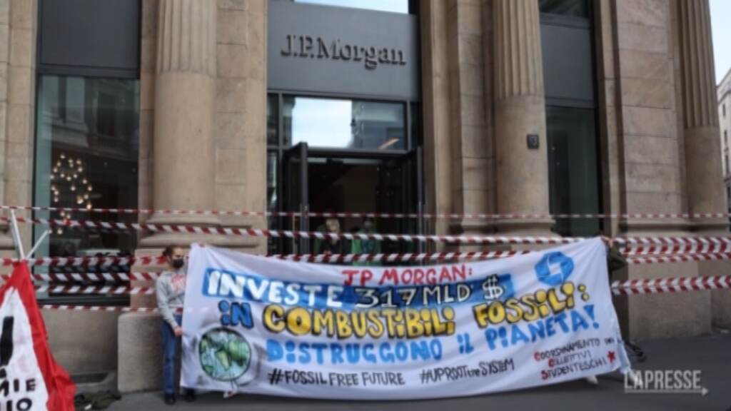 (LaPresse) Azione di protesta di Fridays For Future davanti alla sede di JP Morgan in piazza Cordusio a Milano. Alcuni manifestanti hanno chiuso l’ingresso che porta agli uffici del colosso finanziario con nastro segnaletico e uno striscione in cui accusano Jp Morgan per gli investimenti in combustibili fossili, responsabili della distruzione dell’ambiente.