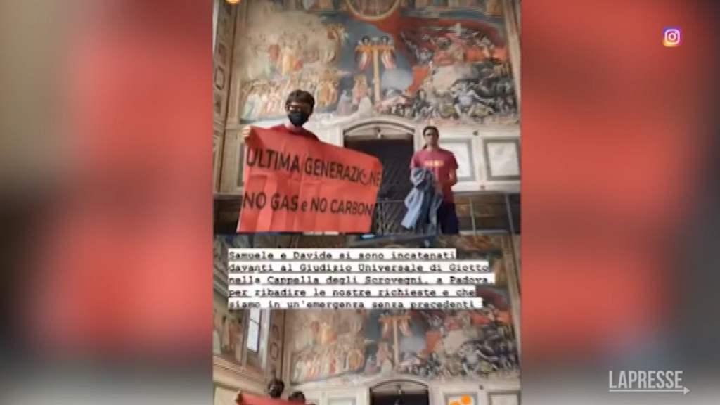 (LaPresse) Nuovo blitz non violento degli attivisti di Ultima Generazione, che stamane sono entrati nella Cappella degli Scrovegni a Padova, incatenandosi alle balaustre che delimitano il percorso dei visitatori al ciclo di affreschi di Giotto. A quel punto uno di loro ha letto ad alta voce i messaggi di protesta del movimento, contro lo spreco di acqua ed energia. Poco dopo è arrivata la polizia, che ha cercato dapprima di convincere gli attivisti a interrompere la protesta, poi, visto il loro rifiuto, ha fatto tagliare con delle cesoie le catene ed ha portato via a braccia i manifestanti.
