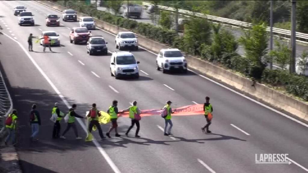 (LaPresse) Nuova azione degli ecologisti di Ultima generazione che questa mattina hanno bloccato il traffico sulla carreggiata esterna del Grande Raccordo Anulare di Roma all’altezza del km 27.800. Gli attivisti si sono seduti sulle corsie di marcia esponendo tre striscioni contro l’uso di combustibili fossili e la carbonizzazione. Tra le richieste, quella di interrompere immediatamente la riapertura delle centrali a carbone esistenti, interrompere il progetto di nuove trivellazioni per la ricerca ed estrazione di gas naturale, incrementare l’utilizzo di energia solare ed eolica. Scene di nervosismo tra gli automobilisti incolonnati e i manifestanti che fortunatamente non sono sfociate in incidenti. Sul posto è intervenuta la polizia stradale che ha sgomberato di peso i dimostranti consentendo così al traffico di riprendere regolarmente.