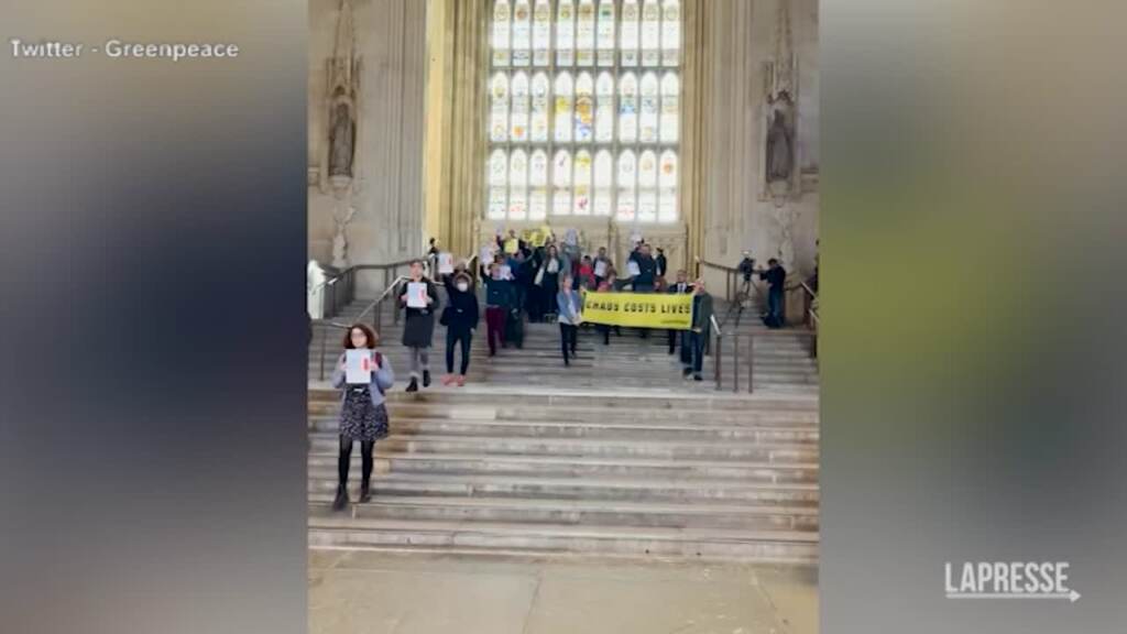 Protesta di una trentina di attivisti di Greenpeace, in un’area pubblica all’interno del parlamento britannico. I manifestanti hanno gridato slogan chiedendo al governo di fare di più sull’aumento delle bollette energetiche. DISTRIBUTION FREE OF CHARGE – NOT FOR SALE