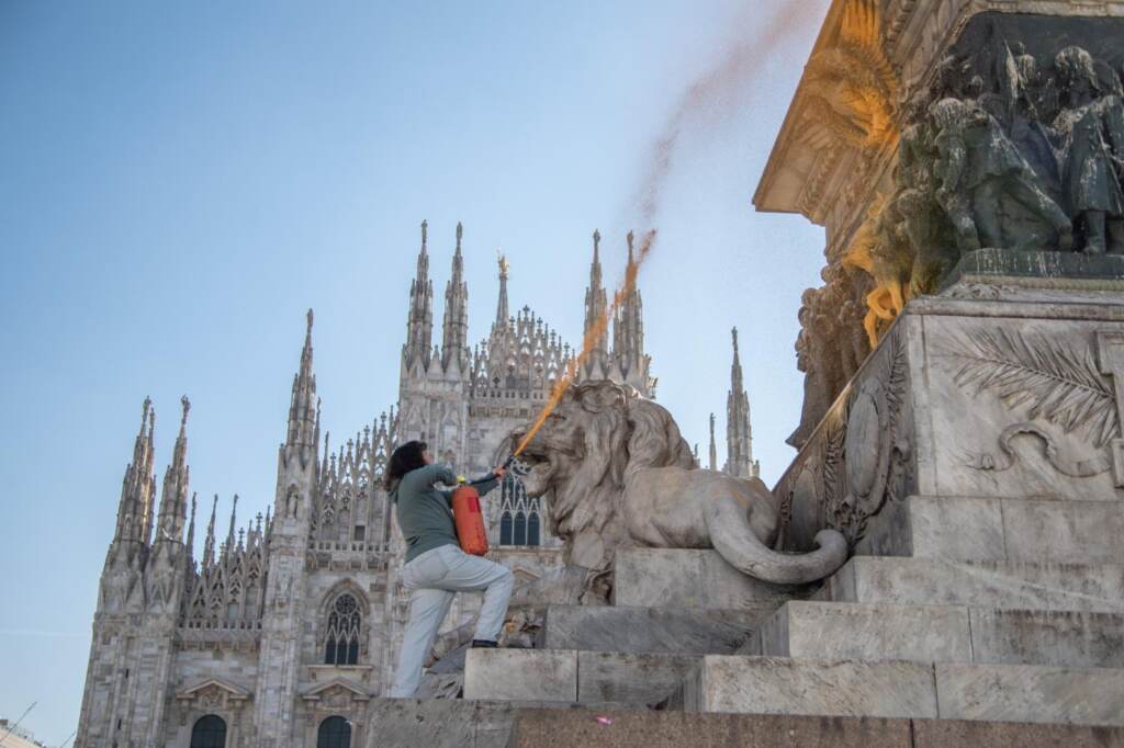 Sono stati denunciati dai carabinieri di Milano i due attivisti che questa mattina hanno imbrattato il monumento di Vittorio Emanuele II in Piazza Duomo. I carabinieri sono intervenuti immediatamente al momento dei fatti allontanando i due manifestanti e accompagnandoli in caserma. Si tratta di un ragazzo di 26 anni e di una ragazza di 23, entrambi del milanese e riconducibili al movimento “Ultima Generazione”. I Carabinieri li hanno deferiti per il reato imbrattamento di beni culturali o paesaggistici , mentre la sola donna è stata anche denunciata per inottemperanza al foglio di via obbligatorio dal Comune di Milano.I militari dell’Arma hanno sequestrato 2 estintori, utilizzati per imbrattare il monumento, lo striscione esposto e i volantini.