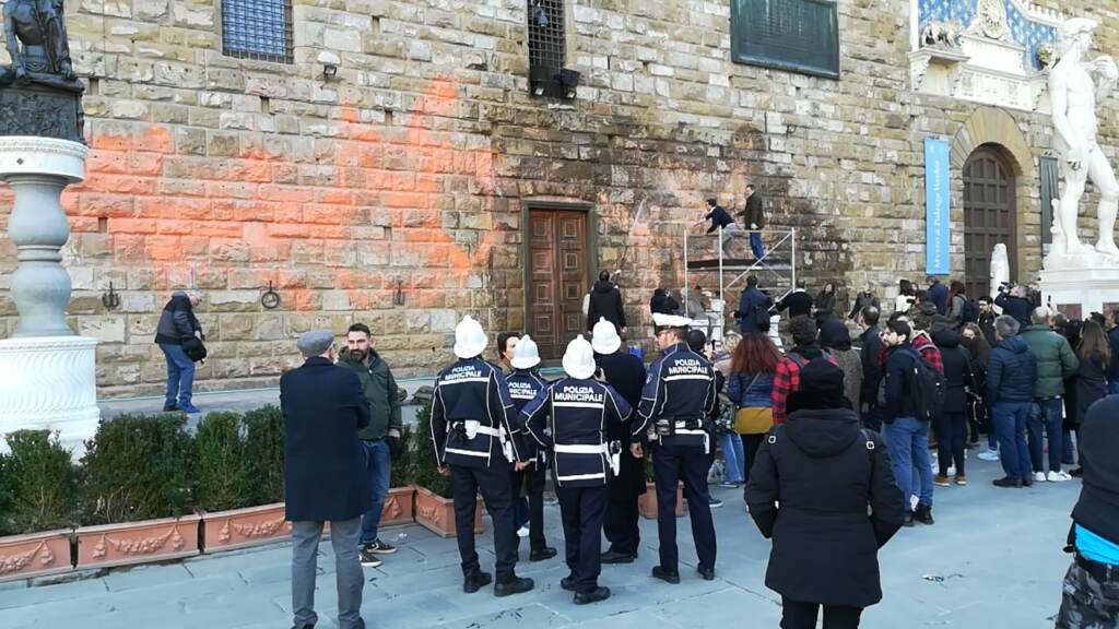 Sono due attivisti della campagna ‘Non paghiamo il fossile’, promossa da Ultima Generazione, Scientist Rebellion e Veglie contro le morti in mare, i ragazzi che hanno imbrattato, questa mattina verso le 10.30, con vernice arancione lavabile, l’ingresso di Palazzo Vecchio in piazza della Signoria a Firenze, utilizzando due estintori.