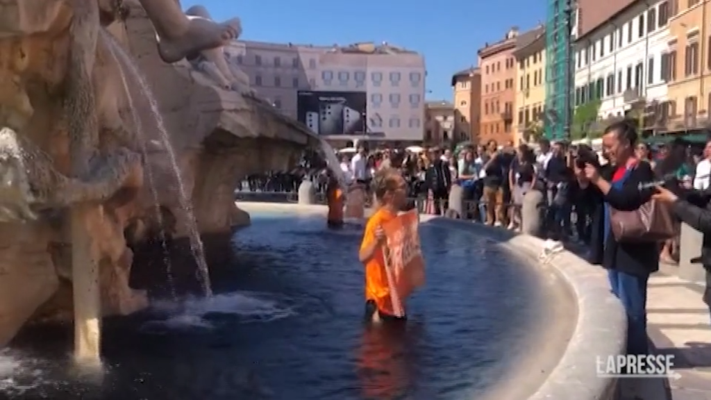 Nuovo blitz ambientalista del gruppo di Ultima Generazione sabato 6 maggio a Roma. Tre attivisti si sono immersi nella vasca della Fontana dei Quattro Fiumi, opera dell’artista Gian Lorenzo Bernini, dopo aver colorato l’acqua di nero. I manifestanti hanno esposto delle bandiere con lo slogan “Non paghiamo il fossile”, prima di venire bloccati dai carabinieri. Il fatto è avvenuto a pochi metri dal palco che domani ospiterà il concerto per il 75esimo anniversario del Senato.