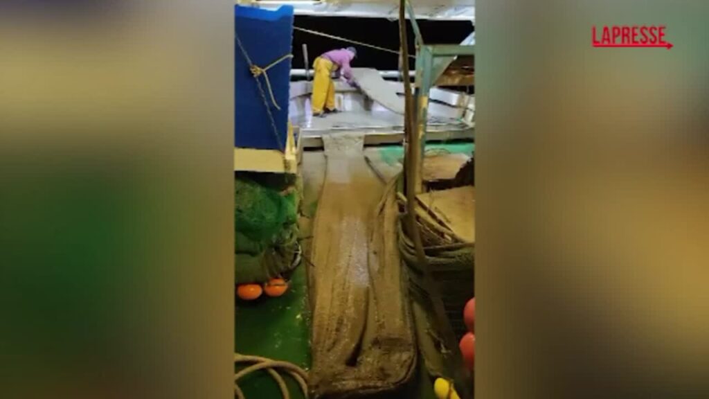 Alcuni pescatori alle prese con la mucillagine marina nelle acque di Numana, nell’Anconetano. Al momento del ritiro delle reti, queste sono piene della sostanza gelatinosa composta da zuccheri e prodotta da alcune alghe, che si accumula sulla superficie marina in presenza di determinate condizioni come alte temperature e scarsa movimentazione delle acque. Nelle ultime settimane grandi quantità di mucillagine marina sono state riscontrate nel mare Adriatico, in particolare sulle coste di Romagna e Marche. La sostanza può costituire un problema per i pescatori non solo perché sporca le reti, ma anche perché riduce la quantità di ossigeno nell’acqua, necessario ai pesci per sopravvivere.