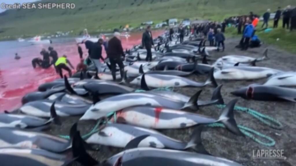 Decine di delfini dal lato bianco senza vita giacciono sulla spiaggia davanti al mare diventato color rosso sangue. Alle Isole Faroe si è ripetuta la tradizionale caccia ai mammiferi che ogni anno scatena le proteste degli animalisti. Oltre 1400 esemplari sono stati trucidati con coltelli e arpioni negli ultimi giorni dai pescatori delle isole semi-autonome danesi nel Nord Atlantico. La caccia a questi animali, uccisi per la loro carne e il loro grasso, va avanti da secoli ed è autorizzata dalle autorità locali: gli attivisti da anni però si battono contro questa pratica ritenuta particolarmente crudele. I branchi di delfini vengono spinti dagli uomini in acque poco profonde e poi colpiti a morte.