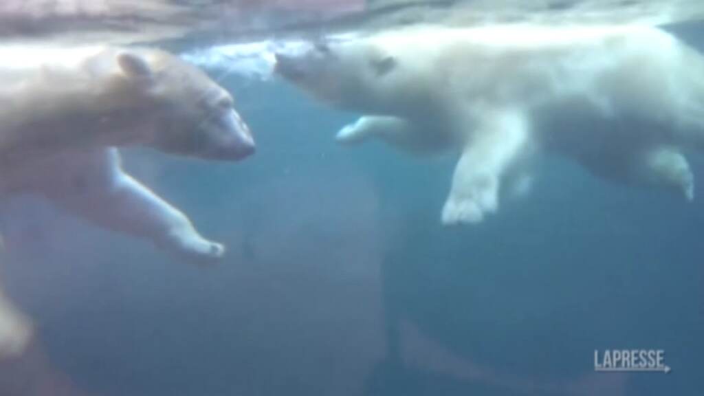 (LaPresse) L’orsa polare Amelia Gray, di cinque anni, e la sua ‘sorellastra’ Nora si sono incontrate per la prima volta questa settimana nello zoo dell’Oregon di Portland. L’ambiente ricreato per loro si chiama Polar Passage e connette due habitat differenti, ognuno con un ambiente naturale e una piscina. Secondo coloro che gestiscono il parco zoologico, i due esemplari giocheranno sempre più spesso insieme nelle prossime settimane. CREDIT: OREGON ZOO