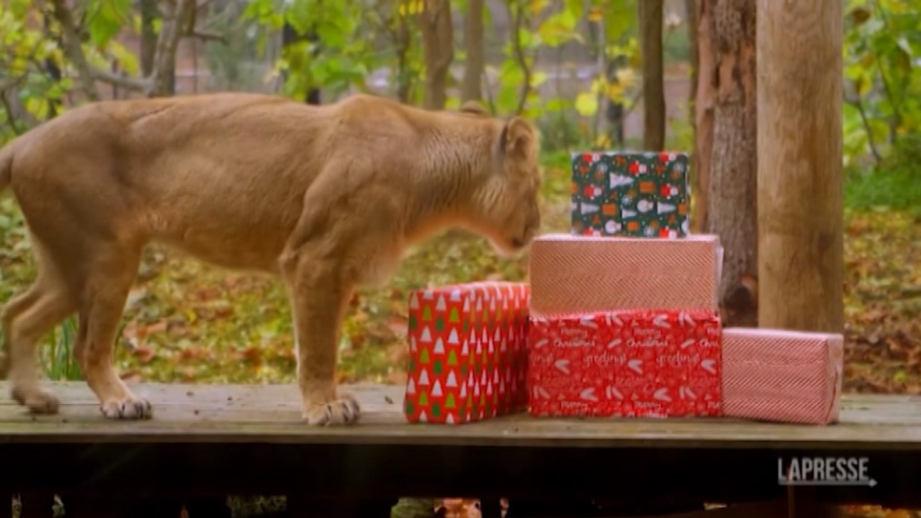 (LaPresse) Quando arriva il Natale animali ed esseri umani non sono poi così diversi. Allo Zoo di Londra leoni e gorilla si sono gettati sui pacchetti natalizi portati dai gestori del bioparco: tra gli animali c’è chi ha prima scrutato i doni, chi ha fatto a pezzi i pacchi e chi si è rotolato nella carta di Natale. La leonessa Arya ha prima scelto con cautela il dono che voleva, mentre il leone Bhanu si è messo a giocare con la carta. Carote e cavolini di Bruxelles si nascondevano invece nei pacchi per i gorilla Alika, Gernot, Mjukuu ed Effie.