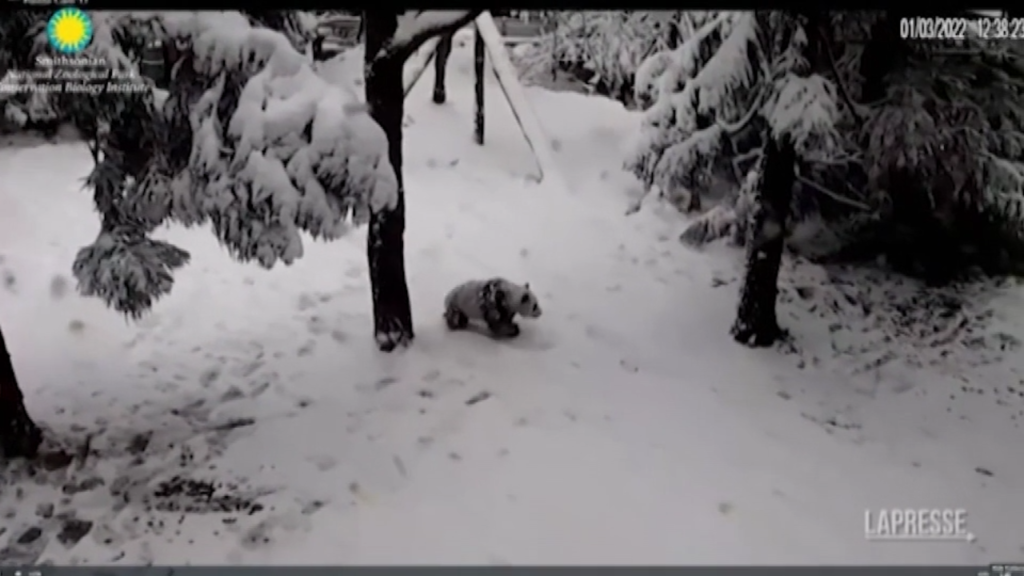 (LaPresse) I panda dello Smithsonian National Zoo si sono divertiti a rotolarsi nella neve e a giocare sul manto bianco dopo la tempesta che ha colpito, tra le altre, Washington D.C. In alcune regioni sono attesi anche 25 centimetri di neve. I venti nella zona soffiano a 56 km/h.