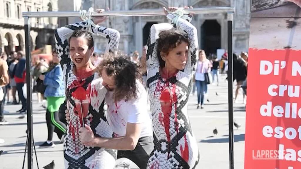 In Piazza del Duomo a Milano, i sostenitori della PETA, vestiti con costumi da serpente e grondanti di “sangue” si sono appesi a una struttura con i loro corpi “tagliati” accanto a un banner che proclama: “Di’ NO alla crudeltà delle pelli esotiche: lascia vivere i serpenti”. L’azione precede l’inizio della Settimana della Moda di Milano e fa parte della campagna della PETA per sollecitare gli organizzatori del’evento ad eliminare le pelli esotiche dalle passerelle.