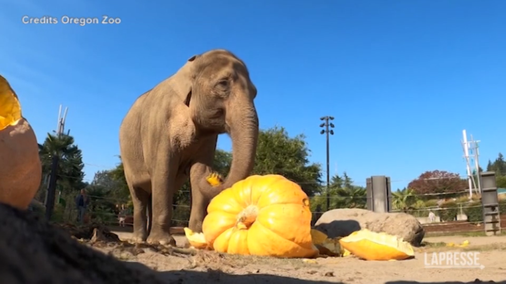 Alcuni elefanti dell’Oregon Zoo di Portland hanno anticipato l’imminente festa di Halloween mangiando alcune zucche giganti. Gli animali hanno potuto giocare e assaggiare diverse zucche donate da alcuni coltivatori locale. Una tradizionale che, nel parco americano, si rinnova ogni autunno dal 1999.