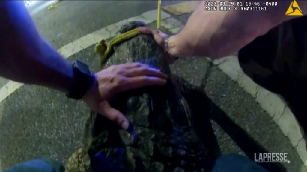 Gli agenti del dipartimento di polizia di Tampa, in Florida, sono dovuti intervenire in una zona commerciale della città per catturare un alligatore selvatico che vagava per strada. Per prendere il grosso rettile, lungo quasi tre metri, ci sono voluti sei poliziotti, che hanno dovuto cercare di tenere sotto controllo l’aggressività dell’animale. Dopo qualche minuto, come si vede nelle immagini filmate dalle bodycam, gli agenti sono riusciti a chiudere la bocca dell’alligatore con dello scotch rendendolo inoffensivo. L’animale è poi stato consegnato a un’associazione che si occupa di conservazione della fauna selvatica.