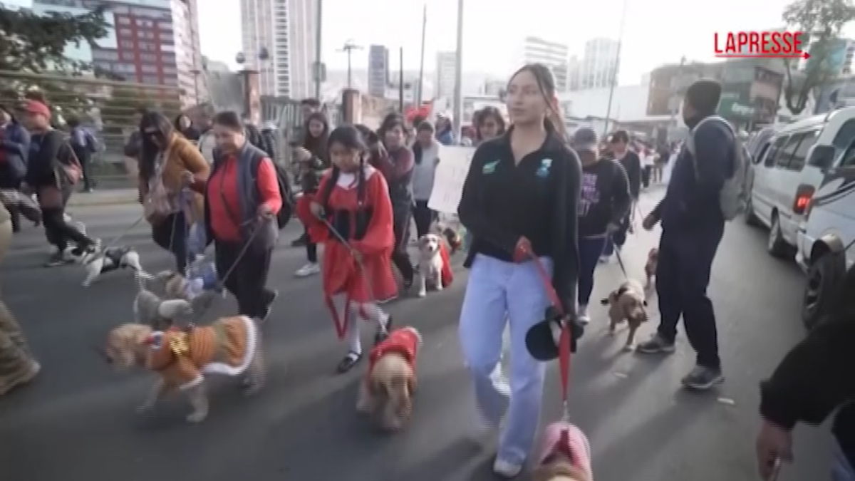 Decine di cani, vestiti con costumi tradizionali boliviani, hanno sfilato al ritmo di tamburi per le strade del centro di La Paz per rendere omaggio alla nazione. Questo evento unico si è svolto nell’ambito delle celebrazioni per il bicentenario della creazione della Bolivia. Alla sfilata hanno preso parte i cani e i loro proprietari, che hanno vestito i loro animali con abiti colorati, carnevaleschi, simboli della cultura popolare e versioni in miniatura dei tradizionali abiti boliviani.