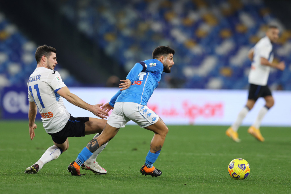 Nell’Atalanta a sorpresa Ilicic si accomoda in panchina: coppia d’attacco tutta colombiana formata da Zapata e Muriel, con Pessina nelle vesti di suggeritore. Ma è Gattuso a stravolgere la formazione tipo, varando un’inedita difesa a tre, con Di Lorenzo e Hysaj sulle fasce a comporre un 3-4-3 con il tridente offensivo leggero composto da Politano, Insigne e Lozano. La mossa sortisce gli effetti sperati per una buona mezzora, perché la Dea fatica a trovare ritmo e a mettere in moto le sue frecce, Gosens e Maehle, costretti a una gara sulla difensiva. Gli ospiti sono insidiosi solo su palla inattiva con Muriel, mentre il Napoli si fa subito notare per una conclusione pericolosa da fuori area di Insigne respinta da Gollini.
