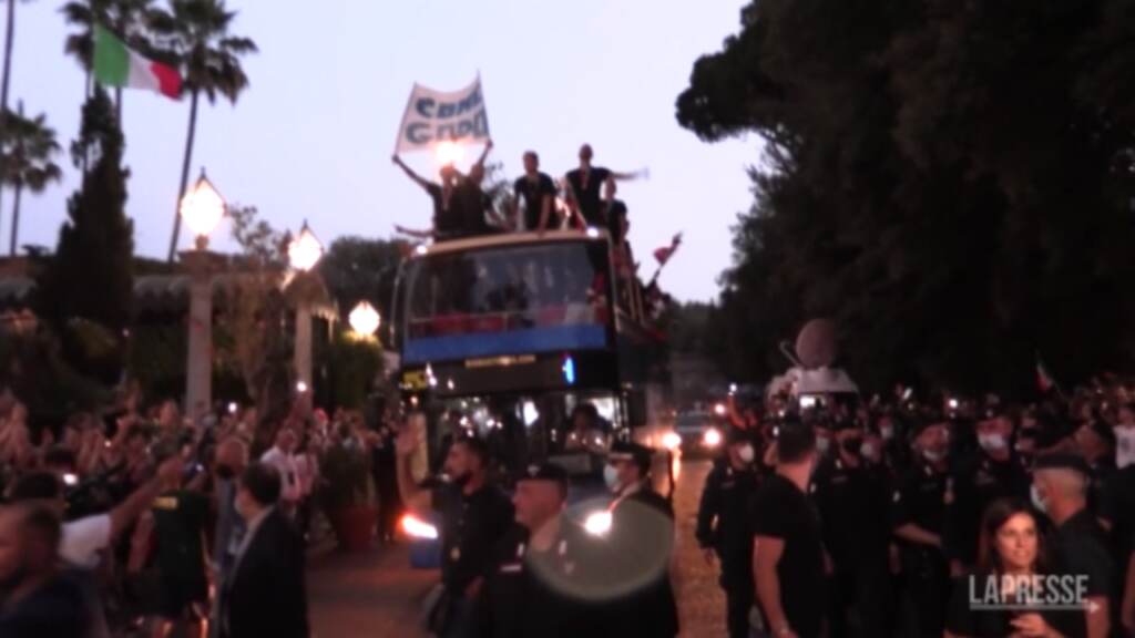 (LaPresse) Dopo il tour trionfale per la città la nazionale italiana, trionfatrice a Euro 2020, è arrivata al Parco dei Principi di Roma dove trascorrerà la notte prima del “liberi tutti”. Ad aspettarli migliaia di tifosi che la polizia a fatica è riuscita a controllare. Giunti all’entrata dell’albergo gli azzurri hanno incitato la folla, Ciro Immobile “armato” di megafono ha intonato un coro per Spinazzola e poi tutti insieme hanno cantato “It’s coming home”.