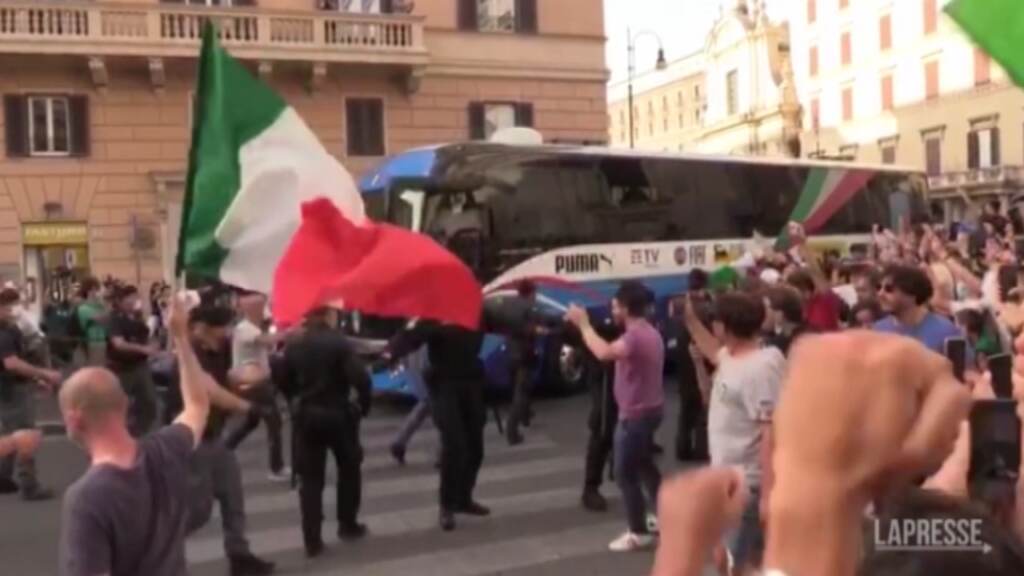 (LaPresse) Una folla di persone ha seguito il pullman della nazionale campione di Euro 2020 diretta a Palazzo Chigi per l’incontro con il premier Draghi. I tifosi hanno sfondato anche il cordone di sicurezza predisposto dalle forze dell’ordine che hanno faticato a contenere l’entusiasmo dei supporter azzurri. Bandiere tricolori al vento e tanti i cori per celebrare il successo a Euro 2020.