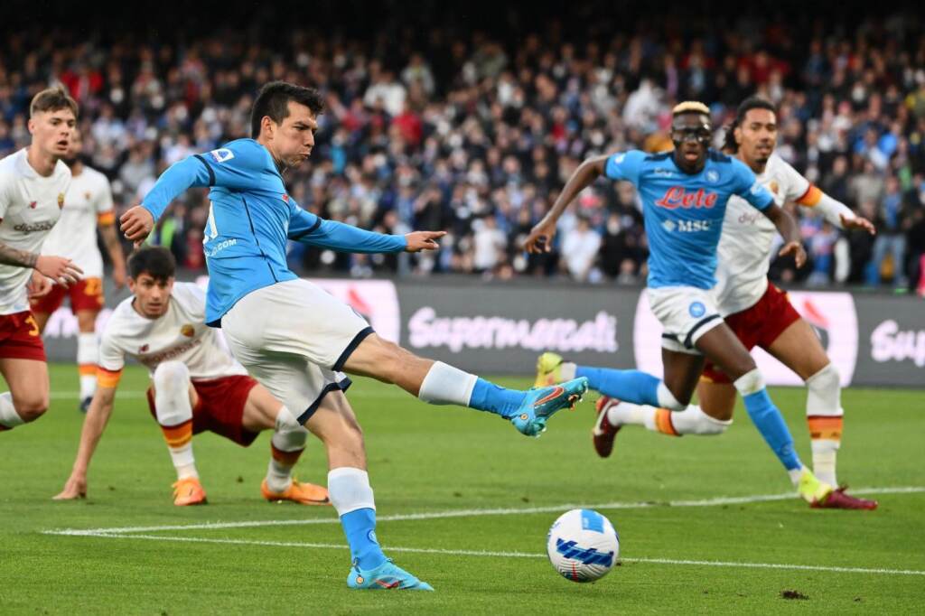 Spalletti sceglie di partire con Lozano a completare il tridente con Osimhen e Insigne dal primo minuto. A centrocampo Anguissa e Lobotka e Fabian Ruiz. Novità in porta con Meret al posto di Ospina, a casa per sintomi influenzali. Il tecnico della Roma Josè Mourinho risponde mandando in campo Zaniolo dopo la tripletta al Bodo, con Pellegrini alle spalle di Abraham. A centrocampo Oliveira al posto di Mkhitaryan. Fasi di studio in avvio con le due squadre che si affrontano in mediana ma il Napoli dopo appena dieci minuti dirotta il match in discesa grazie ad un guizzo di Lozano che in piena area arriva in anticipo su Ibanez che lo fa cadere a terra. L’arbitro non fischia ma viene richiamato dal Var per rivedere le immagini e assegna il penalty agli azzurri considerando fallo l’intervento di Lozano. Insigne dal dischetto non sbaglia.