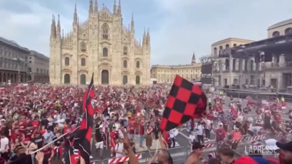 (LaPresse) Milano si tinge di rossonero per il 19° scudetto del Milan conquistato all’ultima giornata davanti ai rivali dell’Inter. La vittoria sul campo del Sassuolo ha infatti regalato alla squadra di Pioli l’agognato successo che mancava dal 2011. Invaso dai tifosi in festa il centro della città, soprattutto la zona di Piazza Duomo letteralmente coperta da una marea rossonera.