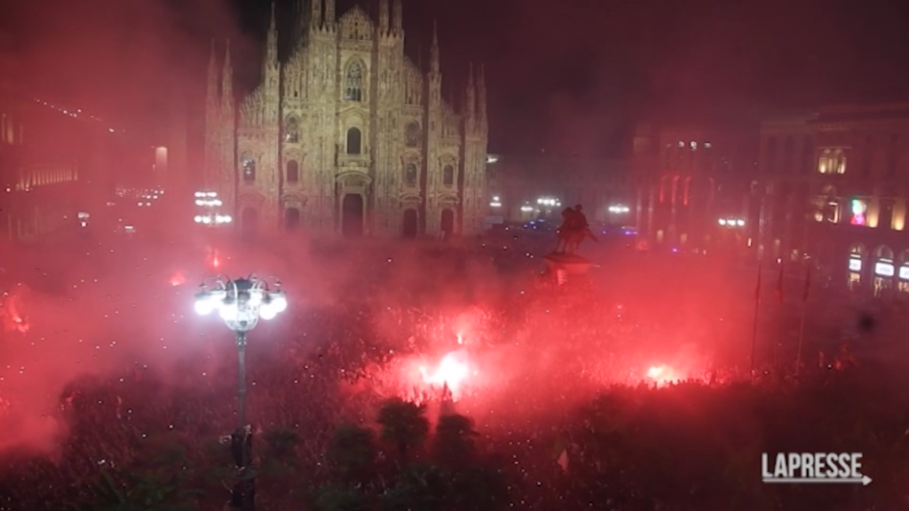 Quasi 4 ore dopo la partenza da Casa Milan, i bus rossoneri sono arrivati in Piazza Duomo. Tra cori e tifosi in delirio, sono partiti anche i fuochi d’artificio.