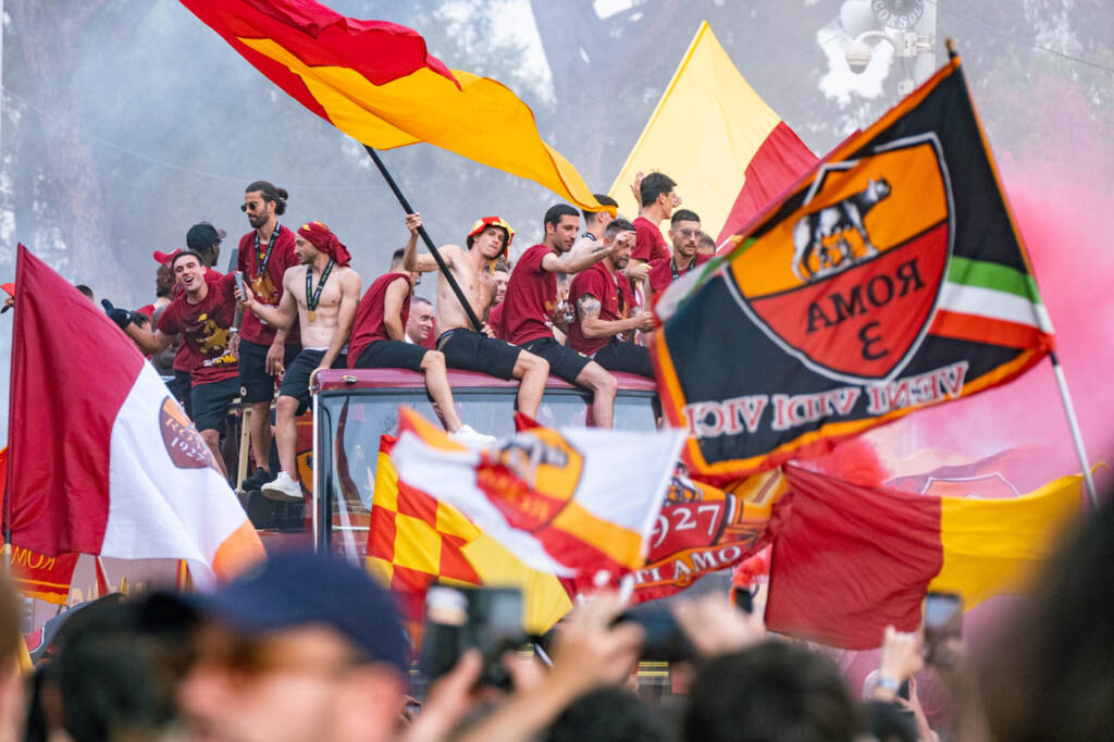 Il popolo giallorosso si è ritrovato al Circo Massimo, teatro dei grandi festeggiamenti per lo scudetto del 2001 e per la vittoria dell’Italia ai Mondiali nel 2006, per celebrare con un mare di bandiere e striscioni i giocatori che a Tirana hanno conquistato la Conference League, battendo gli olandesi del Feyenoord per 1-0 con un gol di Zaniolo. Proprio Zaniolo è stato tra i più attivi, incitando dal pullman scoperto dove viaggiava con la coppa e i compagni di squadra i tifosi a cori e sfottò nei confronti dei rivali. Il difensore albanese Kumbulla ha esposto un cartello con la scritta ‘Lazia’, Tirana brutta aria’, mentre si sono alzati tanti cori dai tifosi all’indirizzo del ds Tiago Pinto, apparso tra i più commossi, per chiedere di portare Dybala alla corte di Mourinho. L’allenatore portoghese affacciato dal pullman ha idealmente abbracciato la folla, mentre i calciatori continuavano a ballare, intonare cori e festeggiare con le 100mila persone, secondo i dati della questura, accorse nell’area del Circo Massimo.