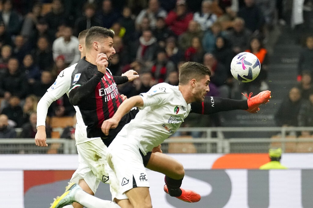 Nella ripresa il Milan parte subito in avanti e al 47′ arriva al tiro Messias, ma Dragowski blocca. Al 50′ è Origi a provare dopo una bella azione personale, ma ancora il portiere spezzino si oppone bene. Al 57′ si fanno vedere i liguri in avanti: il colpo di testa di Ekdal sfiora la traversa e fa tremare per un momento i rossoneri. È un segnale: al 59′ lo Spezia agguanta il pari con un bellissimo tiro a giro dal limite proprio di Daniele Maldini, davanti agli occhi del padre in tribuna. Lo Spezia prende coraggio e campo, ma proprio nel miglior momento degli ospiti Tonali segna con un gran tiro sotto l’incrocio dei pali: un super gol che però è inutile, perché rivedendo l’azione al Var l’arbitro annulla tutto per un precedente fallo di Tomori. Si resta sull’1-1. Per provare a sbloccare la situazione Pioli inserisce Rebic, De Ketelaere e Giroud, grande protagonista in Champions. Al 79′ è lo Spezia a rendersi pericoloso con un pallonetto di Verde che scavalca Tatarusanu ma finisce alto sopra la traversa. Al 87′ è De Ketelaere a sfiorare la rete, Caldara devia il suo tiro ravvicinato in corner. Due minuti dopo la rete decisiva di Giroud: una splendida acrobazia da pochi passi su un traversone di Tonali. L’attaccante si toglie la maglia per festeggiare e, già ammonito, viene espulso lasciando il Milan in dieci. Ma è un ‘danno collaterale’ che i rossoneri possono sopportare, vista la conquista di tre punti che sembravano ormai sfuggiti e che sono fondamentali per restare a una distanza accettabile dai partenopei in fuga.