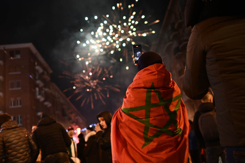 Una folla festante di persone si è riversata in strada a Torino in zona corso Giulio Cesare per la vittoria del Marocco contro la Spagna che manda la formazione nordafricana ai quarti del Mondiale di Qatar 2022.