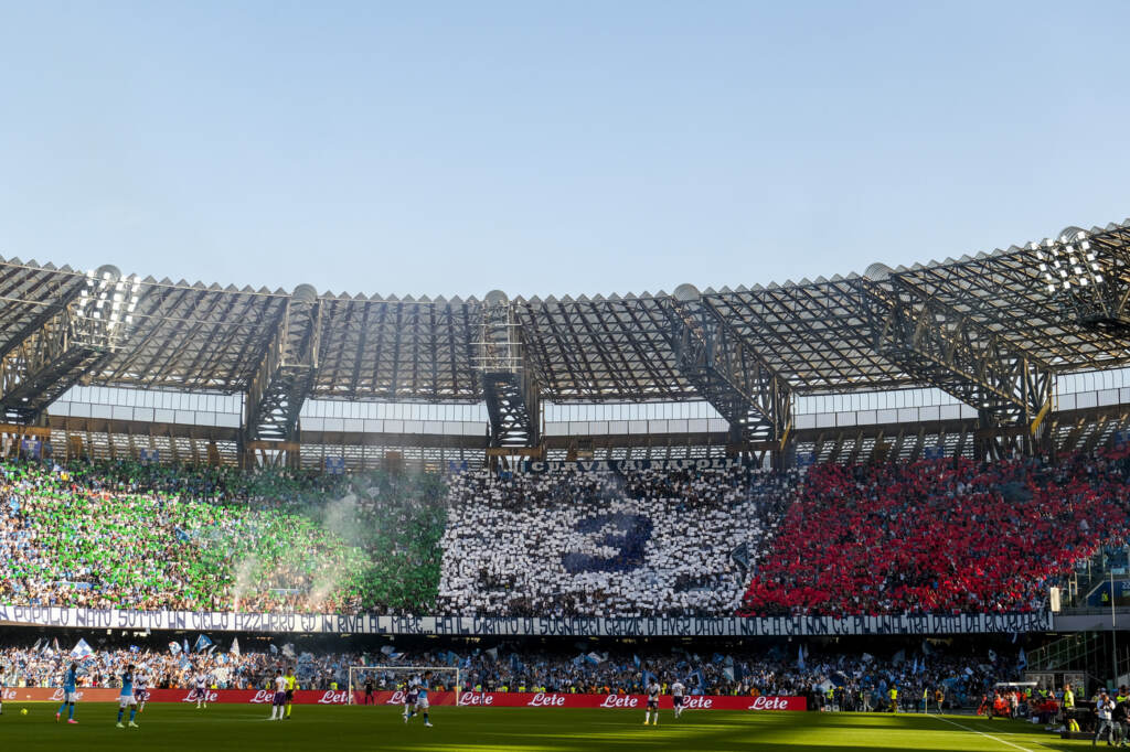 Il ‘Maradona’ ha accolto con un boato l’ingresso in campo del Napoli campione d’Italia per il match di campionato con la Fiorentina. La curva A ha esposto una coreografia con il tricolore e il numero 3 – come gli scudetti conquistati – al centro. Anche la squadra viola ha reso omaggio ai neo campioni d’Italia con il ‘pasillo de honor’, la passerella a formare un corridoio per l’avversario pronto a scendere in campo. Intanto all’esterno dello stadio e nelle vie della città la festa prosegue con migliaia di tifosi riversati in strada. Nel prepartita è sceso in campo anche il regista premio Oscar Paolo Sorrentino, accolto dall’applauso dello stadio.