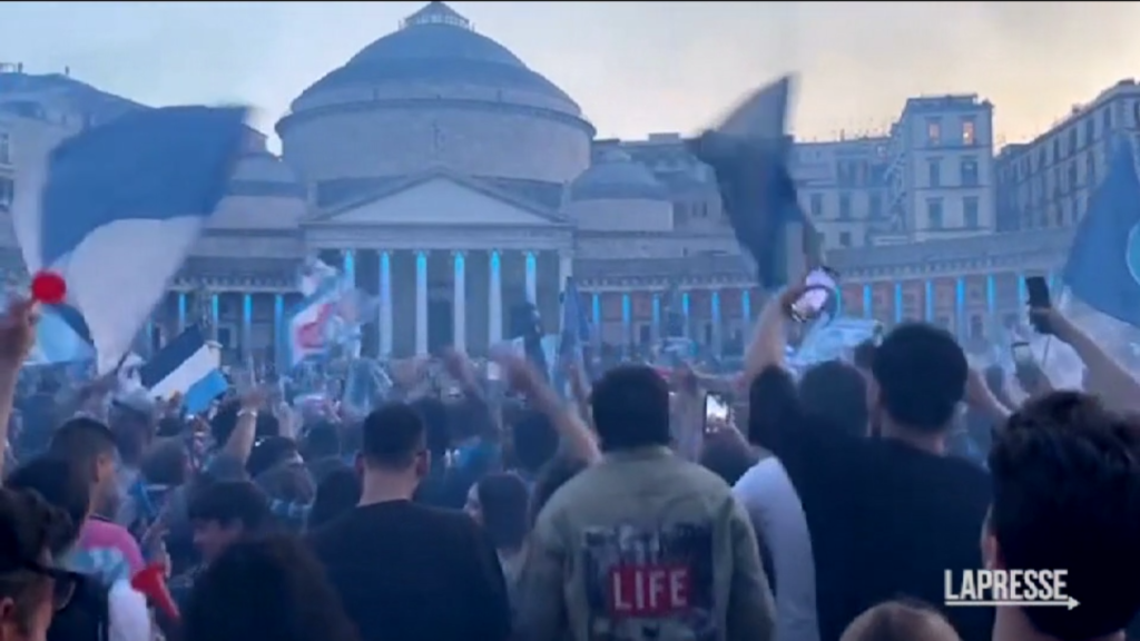 Il Napoli batte 1 -0 la Fiorentina allo stadio Maradona e riesplode la festa per la conquista del terzo scudetto in piazza del Plebiscito. Ancora entusiasmo, canti, cori e bandiere accompagnano migliaia di sostenitori per le vie del centro cittadino.
