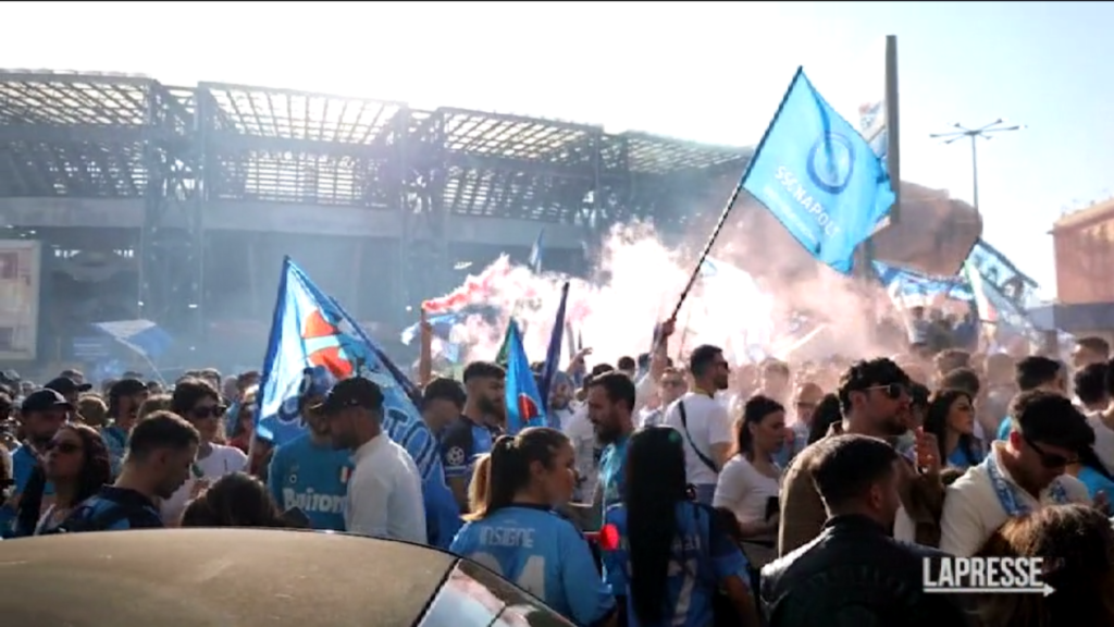 Festa fuori dal Maradona per lo scudetto conquistato dal Napoli giovedì sera a Udine. Gli azzurri hanno battuto 1-0 la Fiorentina, grazie a un rigore di Oshimen.