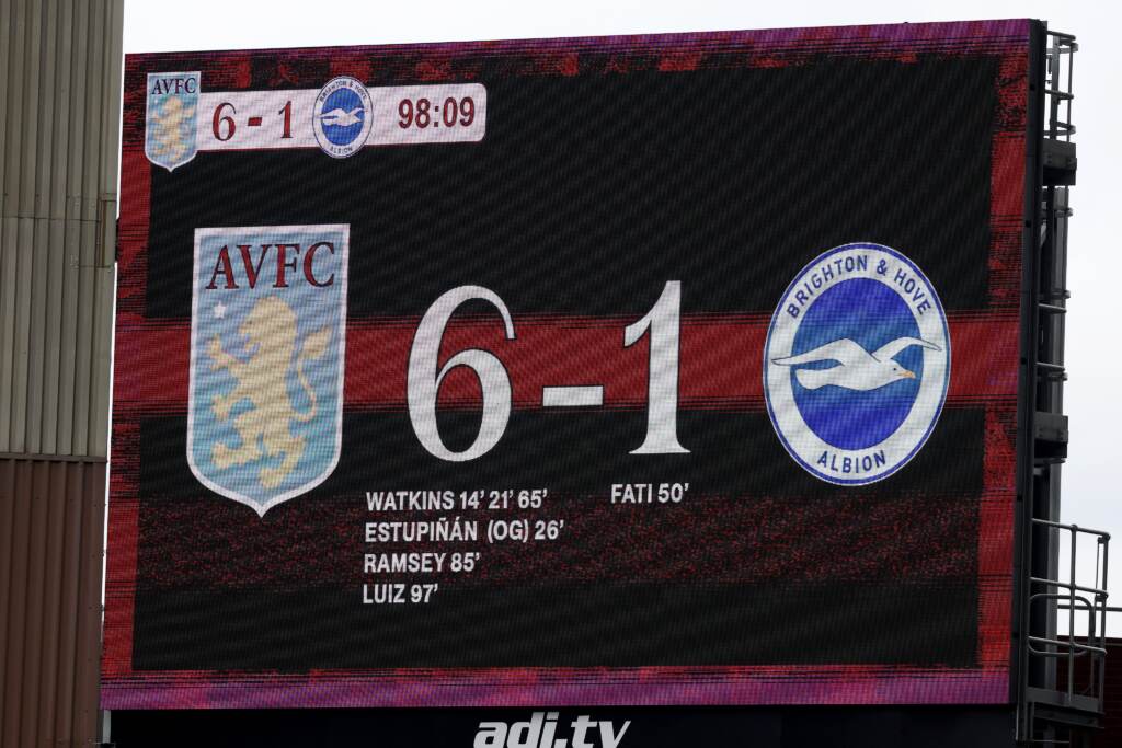 L’Aston Villa ha travolto al ‘Villa Park‘ il Brighton di De Zerbi per 6-1 (tripletta di Watkins) nella gara valida per la settima giornata di Premier League. I Villans salgono momentaneamente al terzo posto con 15 punti appaiando il Brighton.