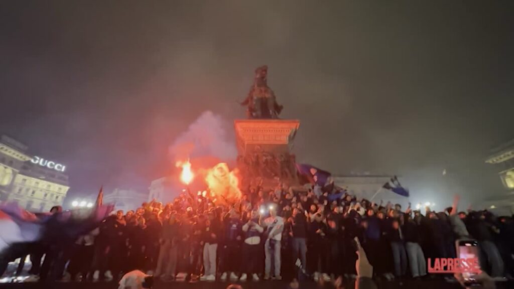 Sarà una lunga notte di festa per i tifosi interisti che in migliaia hanno riempito piazza Duomo a Milano per festeggiare il ventesimo scudetto dell’Inter, ottenuto con la vittoria 2-1 ai danni del Milan nel derby. Fuochi d’artificio, fumogeni, striscioni e tantissimi sfottò da parte dei tantissimi fan della Beneamata. E, grande classico delle feste scudetto a Milano, alcuni tifosi sono saliti a festeggiare sul monumento a Vittorio Emanuele II nel centro della piazza.