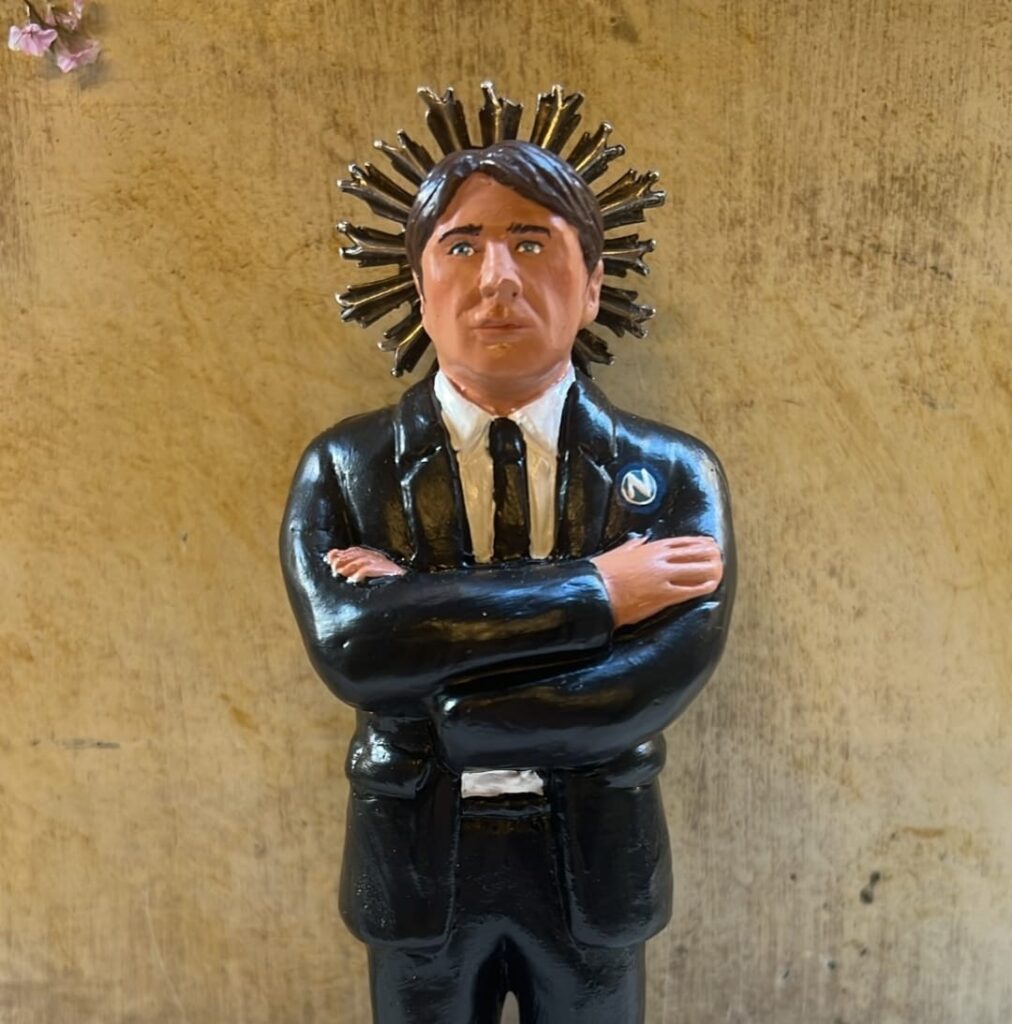 A realizzare la statuina il maestro pastoraio Marco Ferrigno che ha raffigurato Conte in giacca e cravatta, spilletta della SSc Napoli, braccia conserte e una ‘aureola’. Ferrigno ha postato la foto della sua ultima creazione ‘calcistica’ in una storia su Instagram con la scritta: “Sant’Antonio Conte“.