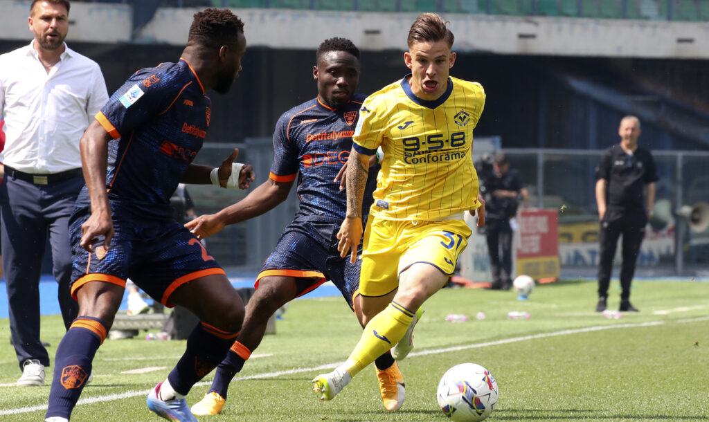 Succede tutto nel primo tempo: il Lecce sblocca la gara a metà della prima frazione con Krstovic, ben servito da Tete Morente. Per il centravanti dei salentini è l’undicesimo gol in campionato, che ne fa uno dei possibili uomini mercato di questa estate. Troppo morbido l’approccio della squadra di Zanetti, che riesce comunque a pareggiare prima dell’intervallo grazie ad un colpo di testa vincente di Coppola sugli sviluppi di un calcio di punizione battuto da Suslov. Nella ripresa la partita si infiamma, con gli scaligeri pericolosi con Serdar e ancora Coppola. La replica del Lecce con Banda che però si divora letteralmente un gol a porta vuota su assist di Pierotti. Da segnalare poi un durissimo scontro tra Mosquera e Gaspar, con il difensore del Lecce che resta a terra a lungo ma dopo qualche momento di preoccupazione si rialza.