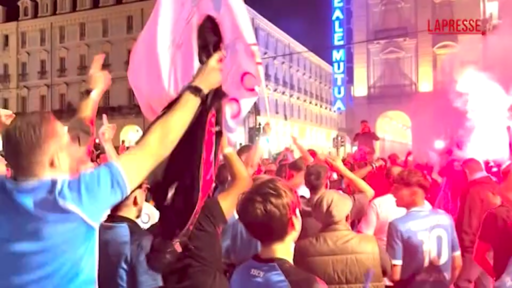 Piazza Castello a Torino si colora d’azzurro per lo scudetto del Napoli. All’ombra della Mole circa 300 tifosi hanno festeggiato il tricolore conquistato dalla squadra di Conte dopo il 2-0 sul Cagliari. Fumogeni, cori, bandiere e persino fuochi d”artificio hanno colorato la piazza torinese fino a tarda notte, a oltre 800 chilometri di distanza dal capoluogo campano.