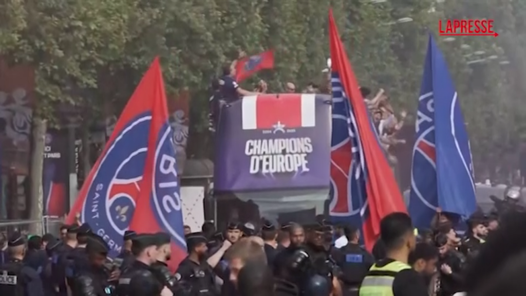 I giocatori del Paris Saint-Germain sfilano per gli Champs Elysees, a Parigi, sfoggiando il trofeo della Champions League. Il club francese ha vinto la prima Coppa dei Campioni della sua storia battendo l’Inter in finale per 5-0. Migliaia di tifosi sono accorsi nella Capitale per festeggiare il trionfo. La squadra ha attraversato la città su due bus scoperti, accolta da applausi, musica e fumogeni.