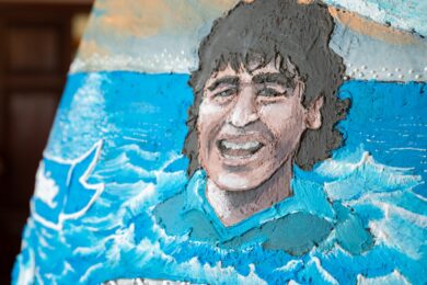 Il colore predominante è l’azzurro, sulla sinistra è rappresentato il lungomare partenopeo con il suo panorama in cui si staglia il Castel dell’Ovo. A destra invece lo sguardo si sposta verso Fuorigrotta, quartiere dove sorge lo stadio dal 2020 intitolato alla memoria di Diego Armando Maradona, il cui volto viene ritratto tra le onde del mare, azzurre come la maglia numero 10 da lui indossata per sette stagioni.