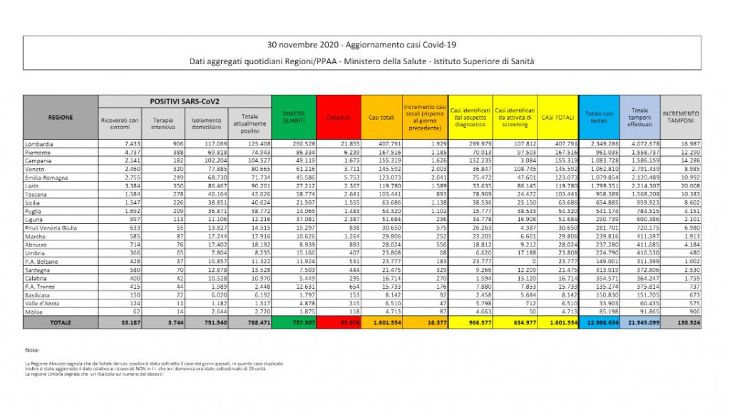 Sono 16.377 i nuovi contagi da coronavirus in Italia, che portano il totale da inizio pandemia a 1.601.554 casi registrati. Salgono nuovamente le vittime, dopo il calo di ieri: 672 nelle utime 24 ore, che portano il totale a sfondare il tetto di 55 mila (55.576 le vittime registrate in Italia). I tamponi sono 130.524: il tasso positivi-test è dunque al 12,5%, più alto di ieri ma in generale più basso rispetto al picco di ottobre, arrivato anche al 16%. Calano gli attualmente positivi (-7.300). I ricoveri tornano ad aumentare ma calano le terapie intensive. Sono invece 23.004 i dimessi/guariti.