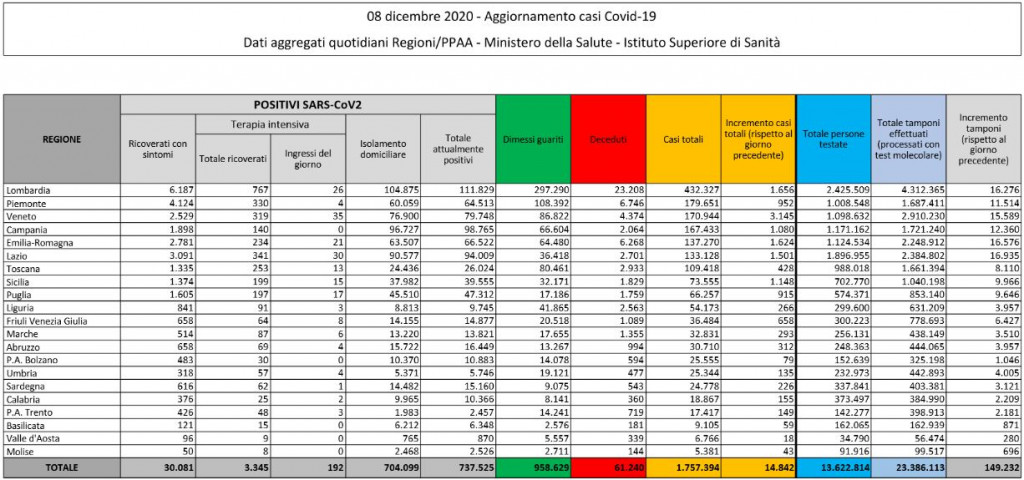 Torna a salire anche il numero dei decessi, che oggi sono 634, ben 106 in più rispetto a ieri. Da quando è scoppiata l’epidemia, nel nostro Paese il totale delle vittime è salito a 61.240.