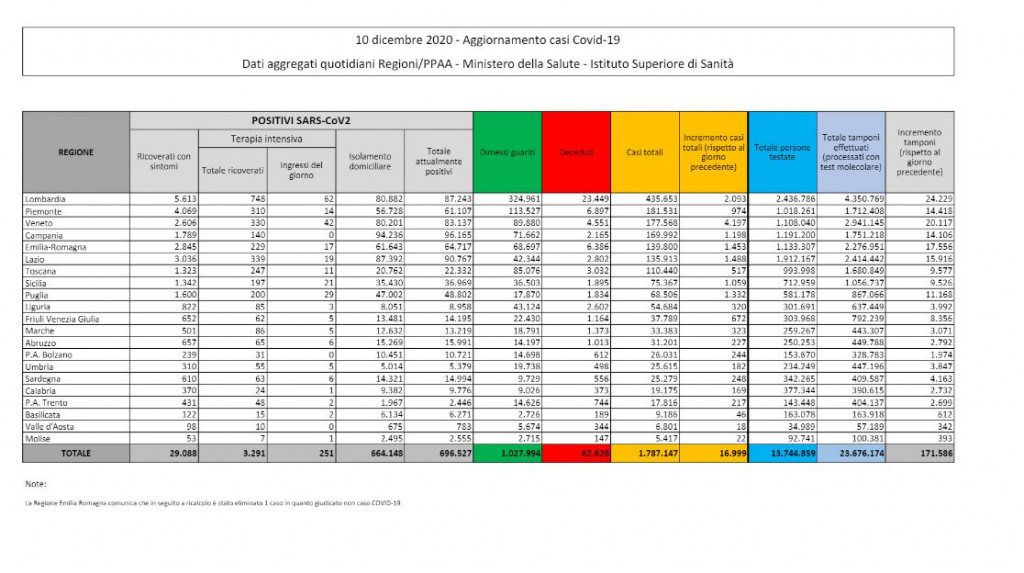 Sono invece 1.787.147 i contagi totali, a fronte di 1.027.994 dimmessi/guariti in totale.