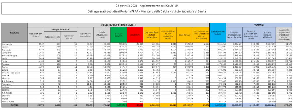 I dimessi-guariti delle ultime 24 ore sono 17.220, mentre gli attuali positivi calano di 3.352 persone. Gli ingressi giornalieri in terapia intensiva sono stati 102, con un saldo tra ingressi e uscite dal reparto in calo di 64 unità riseptto a ieri, mentre nei reparti ordinari i ricoveri sono scesi di 383 unità. Infine, le persone attualmente in isolamento domiciliare sono 451.551.