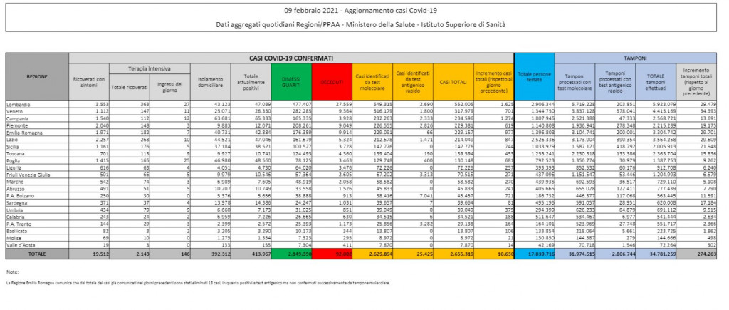 Sono 10.630 i nuovi casi di Covid in Italia, secondo l’ultimo bollettino del ministero della Salute. Sono 422 le vittime, in aumento rispetto ai giorni scorsi: il totale dei morti da inizio pandemia sfora quindi la cifra di 92 mila (che oggi sono 92.002). Sono invece 15.827 i dimessi/guariti. I tamponi processati sono stati 274.263: il tasso di positività scende al 3,9%, dopo essere stato negli ultimi giorni intorno al 5,5%.