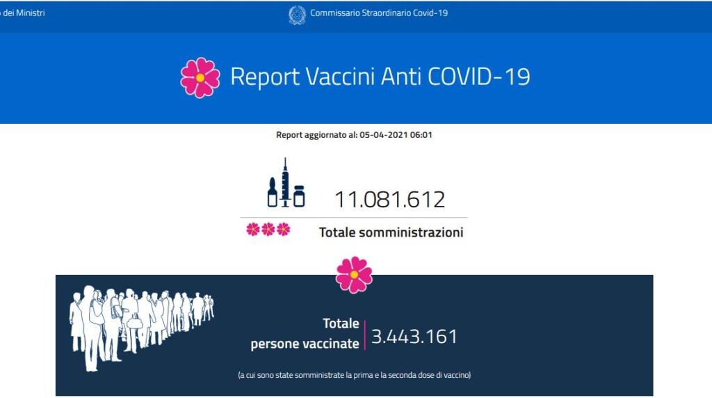 Continua anche nelle festività pasquali la campagna vaccinale in Italia contro il Covid-19: secondo l’ultimo report del ministero della Salute, aggiornato all’alba del 5 aprile, sono 11.081.612 le somministrazioni effettuate fino ad ora, per un totale di 3.443.161 persone a cui sono state somministrate entrambe le dosi di vaccino.