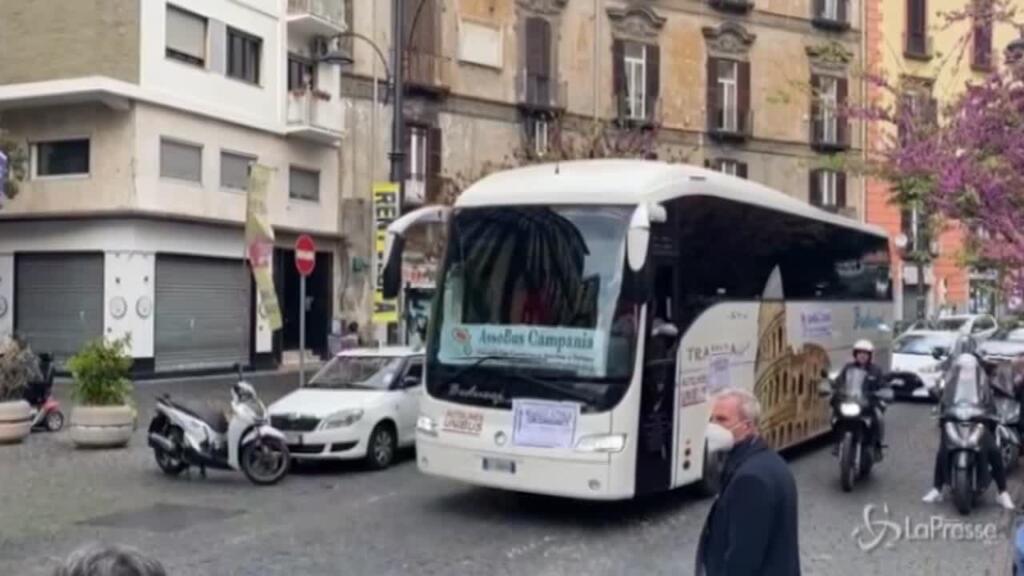 (LaPresse) I bus turistici hanno circondato la sede della Giunta Regionale della Campania, una presidio pacifico per chiedere un incontro con il governatore Vincenzo De Luca sulla loro condizione attuale, in seguito alla pandemia. I lavoratori chiedono il blocco dei pagamenti della tassa di possesso degli automezzi ritenendolo un provvedimento di giustizia in quanto la categoria è praticamente ferma da circa un anno.