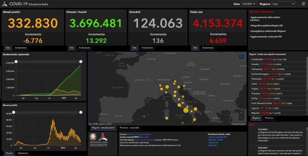Sono 6.659 i nuovi casi di coronavirus registrati in Italia nelle ultime 24 ore, secondo il quotidiano report diffuso dal ministero della Salute, su 294.686 tamponi analizzati. Il tasso di positività è pari al 2.3%, leggermente in calo rispetto ai giorni precedenti. Sono 136 i decessi , in calo rispetto a ieri (182). Il totale delle vittime da inizio pandemia è ora di 124.063.