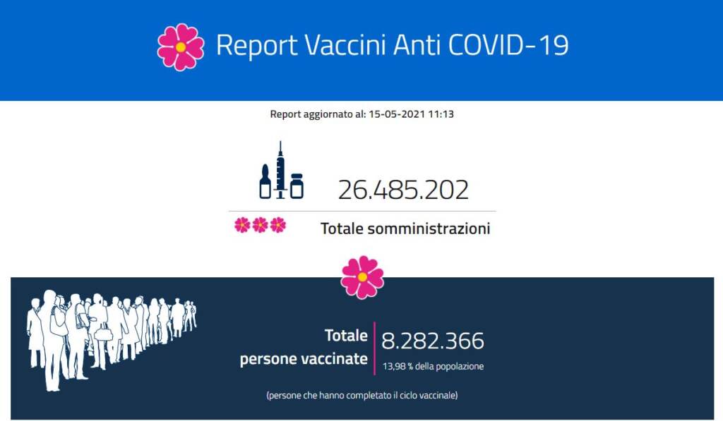Sono 26.485.202 le persone che hanno ricevuto una dose di vaccino anti-Covid in Italia, secondo l’ultimo report del ministero della Salute, mentre 8.282.366 sono le persone che hanno completato il ciclo vaccinale, pari al 13,98 % della popolazione.