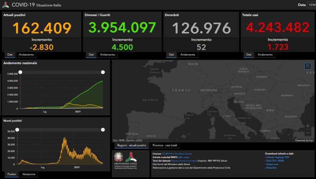 I dimessi e guariti sono 4.500, mente i nuovi positivi calano di -2.830 unità.