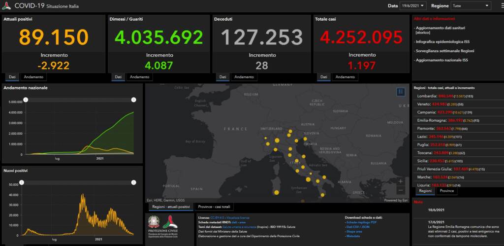 Sono 1.197 i nuovi contagi da Covid-19 in Italia a fronte di 249.988 tamponi. Il tasso di positività si attesta allo 0,48%. Lo evidenzia l’ultimo bollettino del ministero della Salute. I decessi sono 28 per un totale aggiornato a quota 127.253. Continua la discesa dei numeri degli ospedali. I pazienti in terapia intensiva sono scesi a quota 394, -22 in 24 ore, mentre i ricoveri ordinari sono ora 2.504, -176 rispetto all’ultime rilevazione. Scende sotto soglia 90mila il numero degli attuali positivi al Covid in Italia: secondo i dati del bollettino del ministero della Salute sono infatti 89.150 le persone alle prese con il virus, con un calo di -2.922 rispetto alle 24 ore precedenti. Di queste 86.252 sono in isolamento domiciliare.