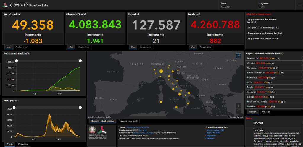Le vittime registrate in un giorno sono 21, per un totale da inizio pandemia di 127.587 morti di Covid. 1.941 i dimessi/guariti in 24 ore.