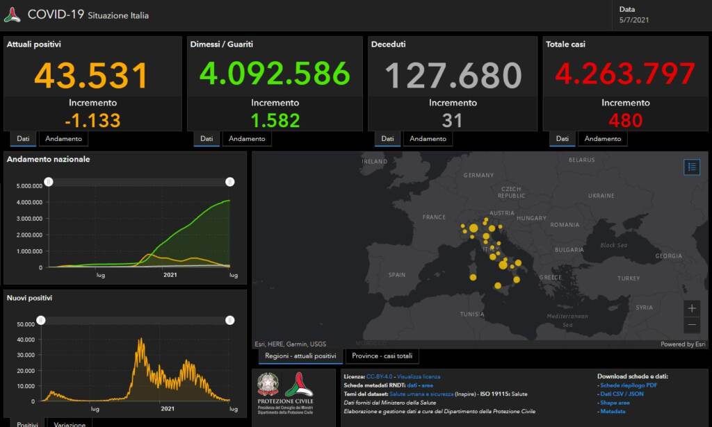 Sono 480 i nuovi casi su 74.649 tamponi processati, in calo come ogni fine settimana – secondo il quotidiano bollettino del ministero della salute – e 31 le vittime nelle utlime ore. Il tasso di positività allo 0,6%.